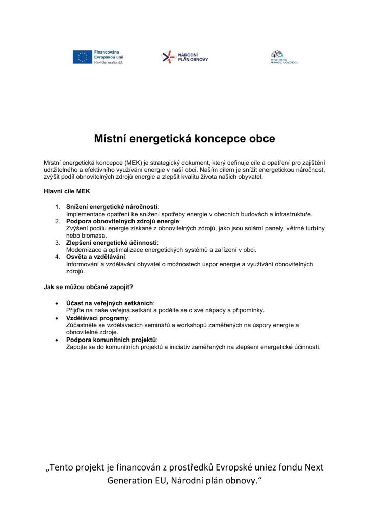 Místní energetická koncepce (MEK) je strategický dokument, který definuje cíle a opatření pro zajištění udržitelného a efektivního využívání energie v naší obci. Naším cílem je snížit energetickou náročnost, zvýšit podíl obnovitelných zdrojů energie a zlepšit kvalitu života našich obyvatel.
