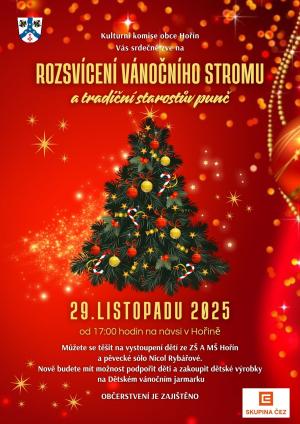 Kulturní komise obce Hořín Vás srdečně zve na rozsvícení vánočního stromu a tradiční starostův punč. Sejdeme se v sobotu 29. listopadu v 17:00 hodin na návsi v Hoříně. Vystoupí děti ze ZŠ a MŠ Hořín, které můžete podpořit na Dětském vánočním jarmarku.