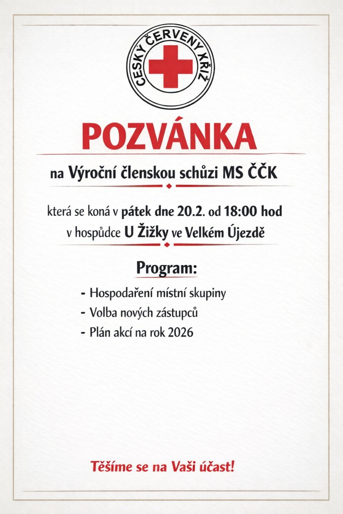 MS ČČK VÚ zve na výroční členskou schůzi, koná se v pátek 20. 2. 2026 od 18h v hostinci U Žižky ve Velké Újezdě.